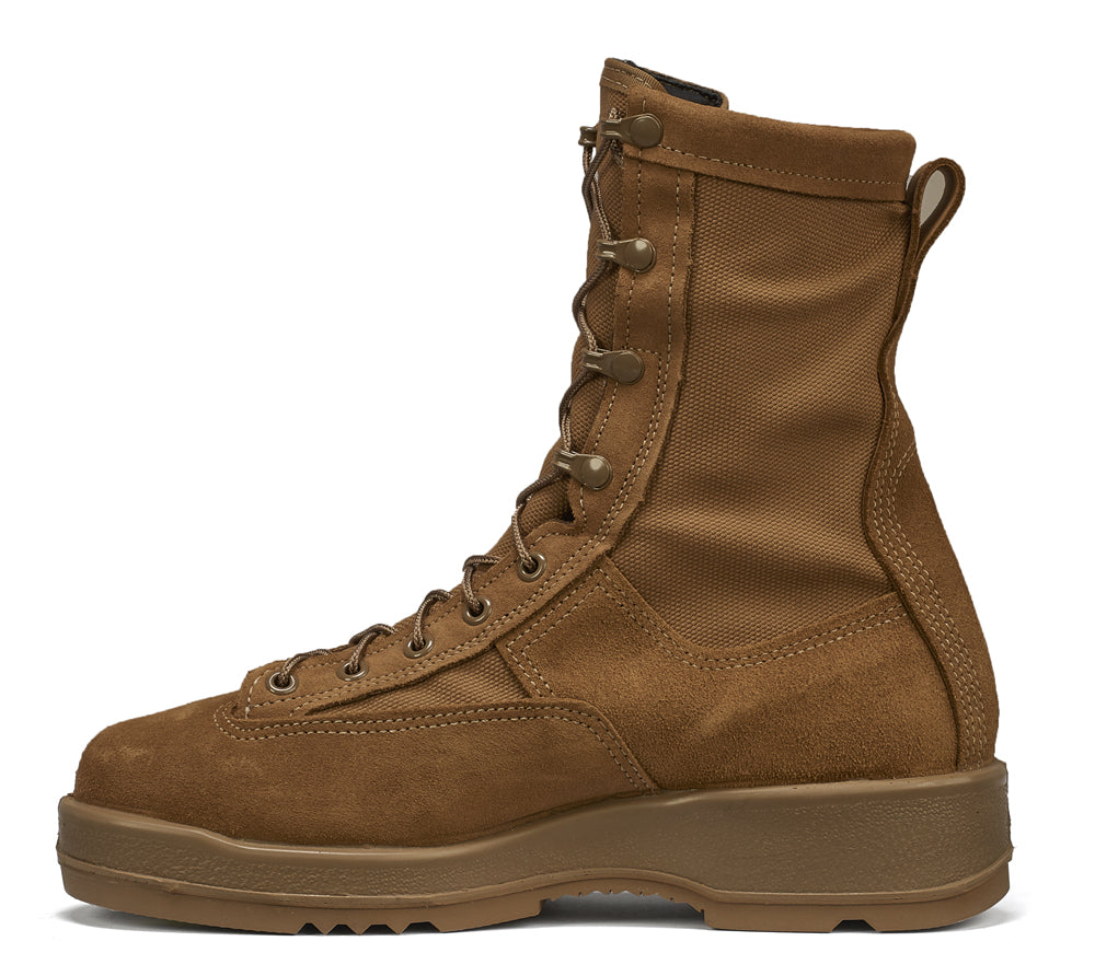 Military aviators require boots that are specifically designed for the cockpit and flight-line environment. The Belleville 330 COY ST Coyote Brown Hot Weather Steel Toe Flight Boot was designed for U.S. Navy and U.S. Marine Corps Aviators looking for a top performing coyote boot with steel toe protection. This newly released version was intended for wear with the ACU OCP uniform. This boot features an upper made of Pure Tan Leather and flame-resistant WT-2 Flight Approved Fabric. It features the Vibram Chevron outsole which was designed specially for the flight line because its sole pattern resists attachment to foreign object debris (FOD). The Belleville 330 COY ST features the Vanguard running shoe design to give you an athletic fit and feel. This boot is Berry Compliant and made in the USA.