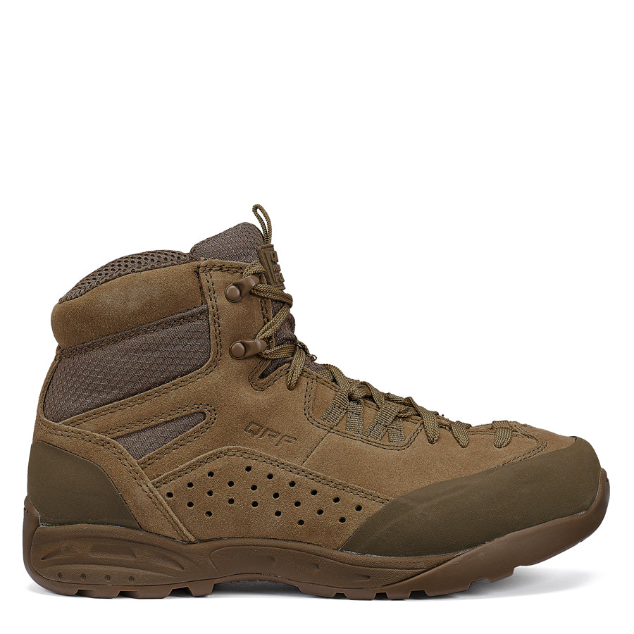 Belleville's QRF series boots were designed with the military's quick reaction force (QRF) in mind. For an armed military unit capable of rapidly responding to developing situations, shaving time off deploying is critical. This boot gets you on your way quickly with speed laces. It's lightweight and breatheable design keeps you focusing on your mission and not on your feet. For hot weather or environments where a full 9inch boot isn't needed, the Belleville QRF Delta C6 Men's Boot is a top contender. The coyote brown colored suede and full grain leather provides excellent camouflage and was intended for operations in the Middle East. This boot aids in rope climbing and rappeling with a fast rope channel with high friction rubber for controlled descents. This boot is highly cushioned and features a shock absorbent EVA midsole to absorb shock and reduce fatigue. An enhanced slip resistance outsole provides excellent grip for all environments.